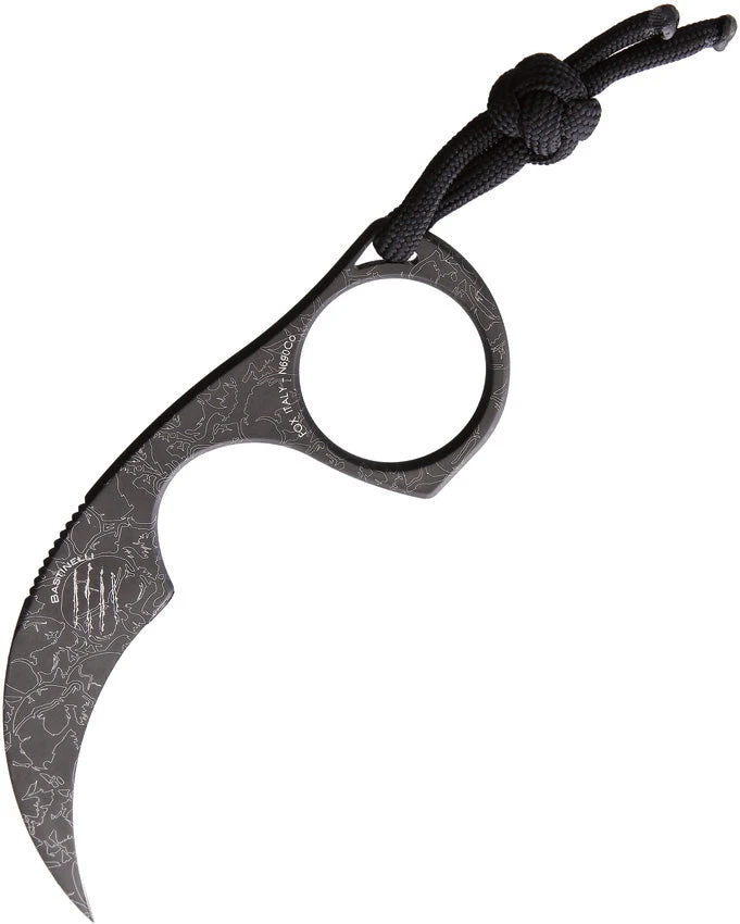 3.75″ (9.53cm) overall. 1.5″ (3.81cm) black PVD coated N690Co steel karambit blade. One-piece construction. Finger ring. Engraved skull artwork. Black Kydex neck sheath. Boxed.