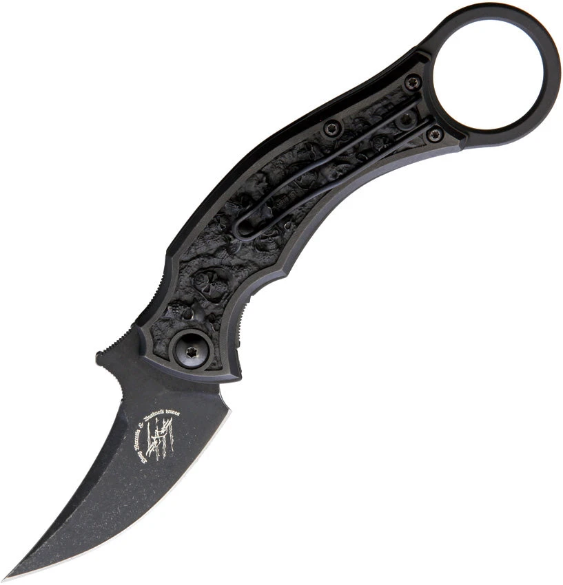 4.75″ (12.07cm) closed. 2.75″ (6.99cm) black stonewash finish Bohler N690 stainless blade. Sculpted bronze handle. Finger ring. Pocket clip. Extended tang. Comes with a set of black GRN handle scales. Boxed.