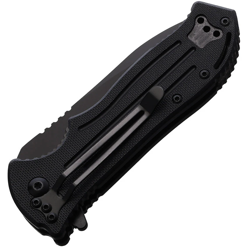 Assisted opening. 4.25″ (10.8cm) closed. 3.25″ (8.26cm) black DLC coated D2 tool steel spear point blade. Black G10 handle. Extended tang. Lanyard hole. Pocket clip. Boxed with hanging tab.
