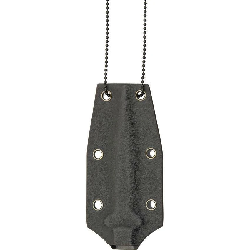 7.25″ overall. 4.13″ titanium coated 440C stainless blade. Black textured G10 handle. Full tang. BESH-Wedge blade. Black Kydex neck sheath. Boxed.