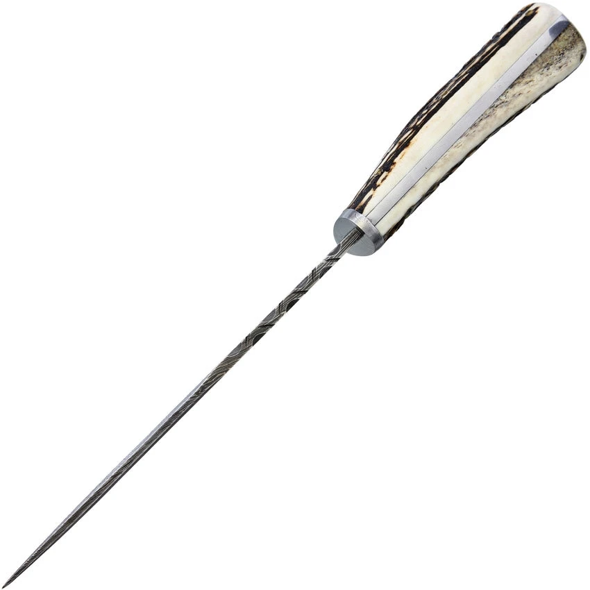 11.25″ overall. 6.75″ Damascus steel clip point blade. Stag handle. Stainless bolster(s). Brown leather belt sheath. Boxed.