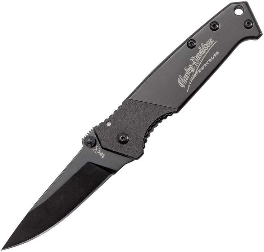 AO1224.5T pattern. Assisted opening. 4.5″ closed. 3.25″ gray titanium coated 440 stainless tanto blade. Black textured G10 handle with gray stainless back handle. Thumb stud. Lanyard hole. Pocket clip. Harley Davidson handle artwork. Boxed.