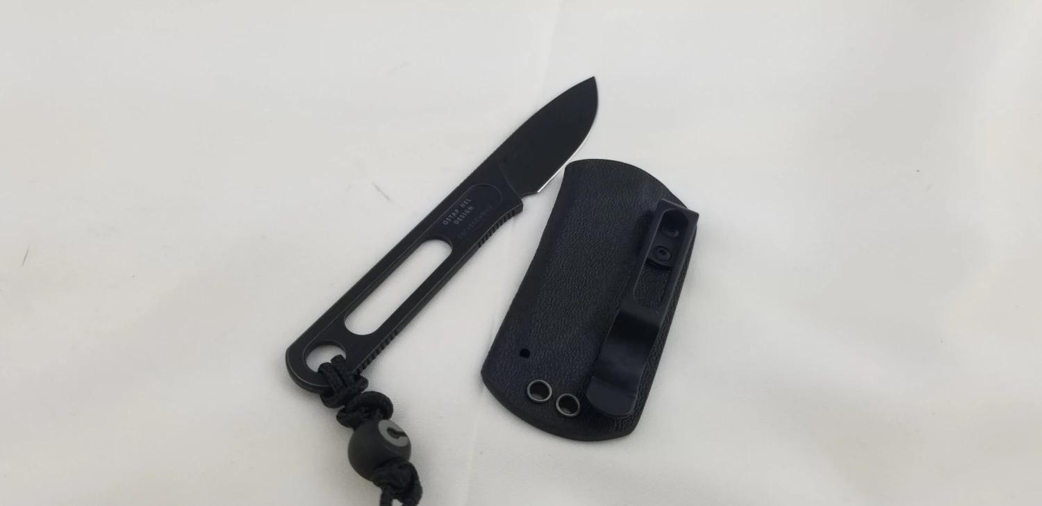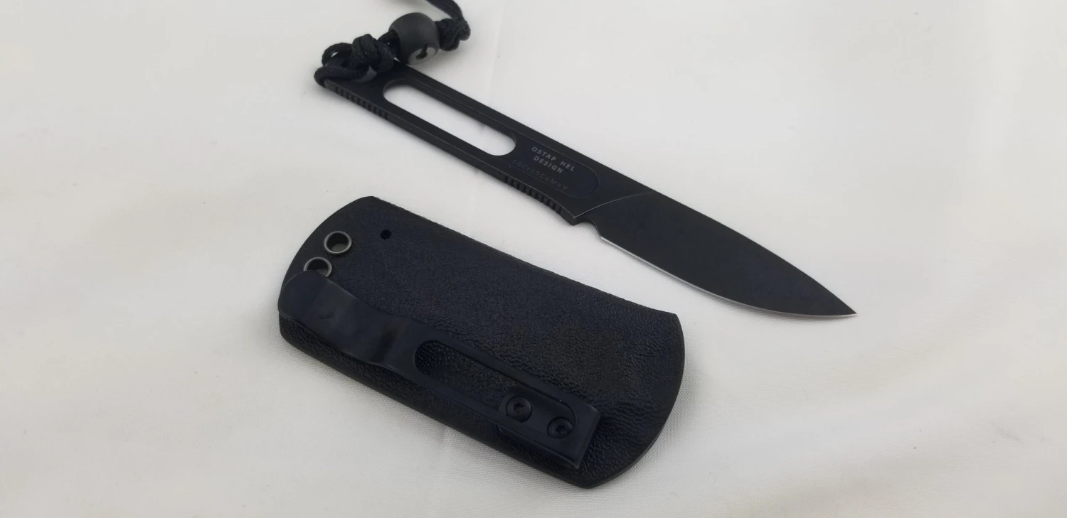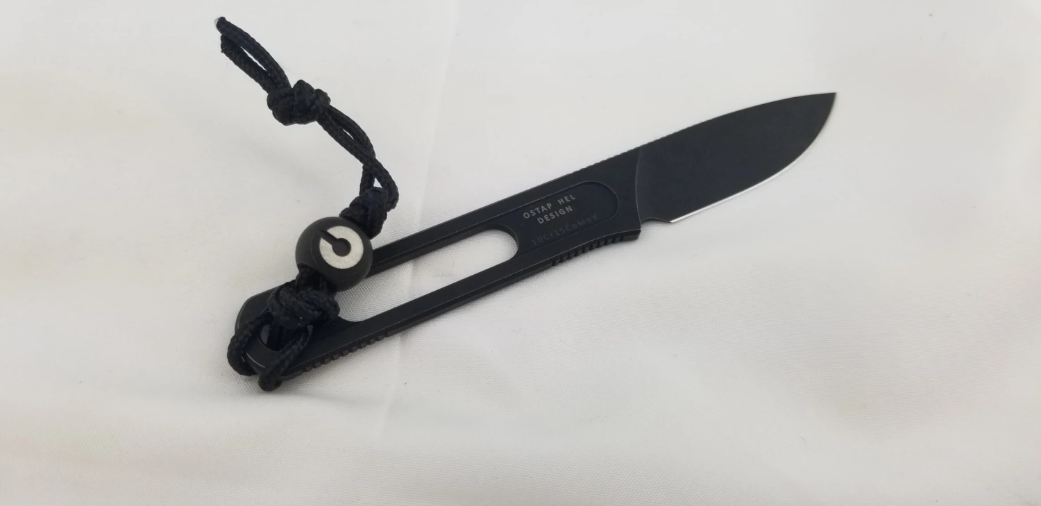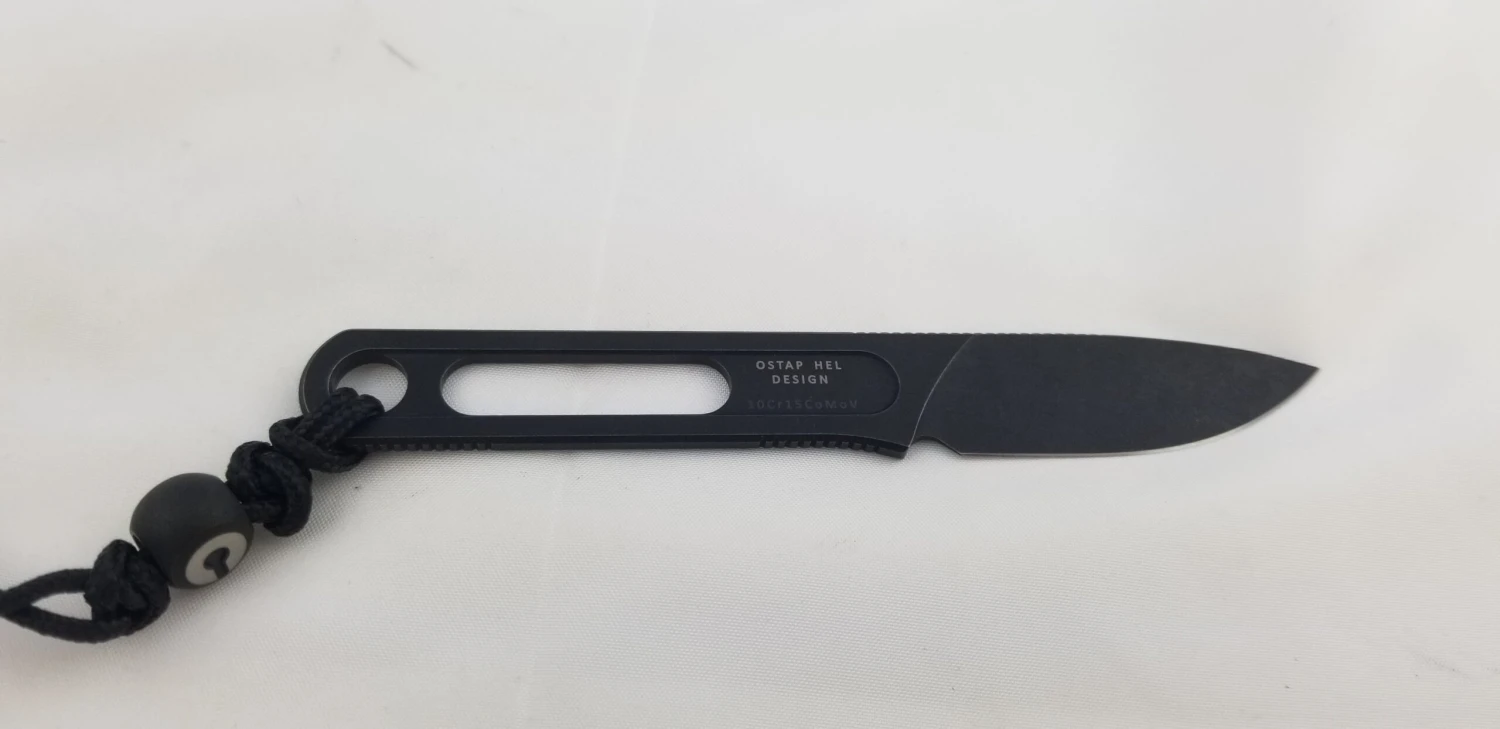 4.96” overall. 2.22” Black stonewash finish 10Cr15CoMoV drop point blade. Flat Grind. Lanyard Hole. Comes with a black kydex sheath and lanyard. This knife was designed by Ostap Hel. Boxed.