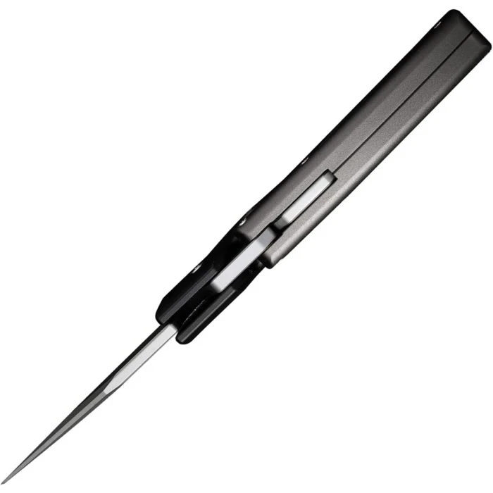 Stonewash finish false edge 14C28N steel dagger blade. Black and gray aluminum handle. Fixed blade position: 6.25″ overall with 2.27″ blade; Push dagger position: 4.53″ overall with 3″ blade. Black leather belt sheath. Boxed.
