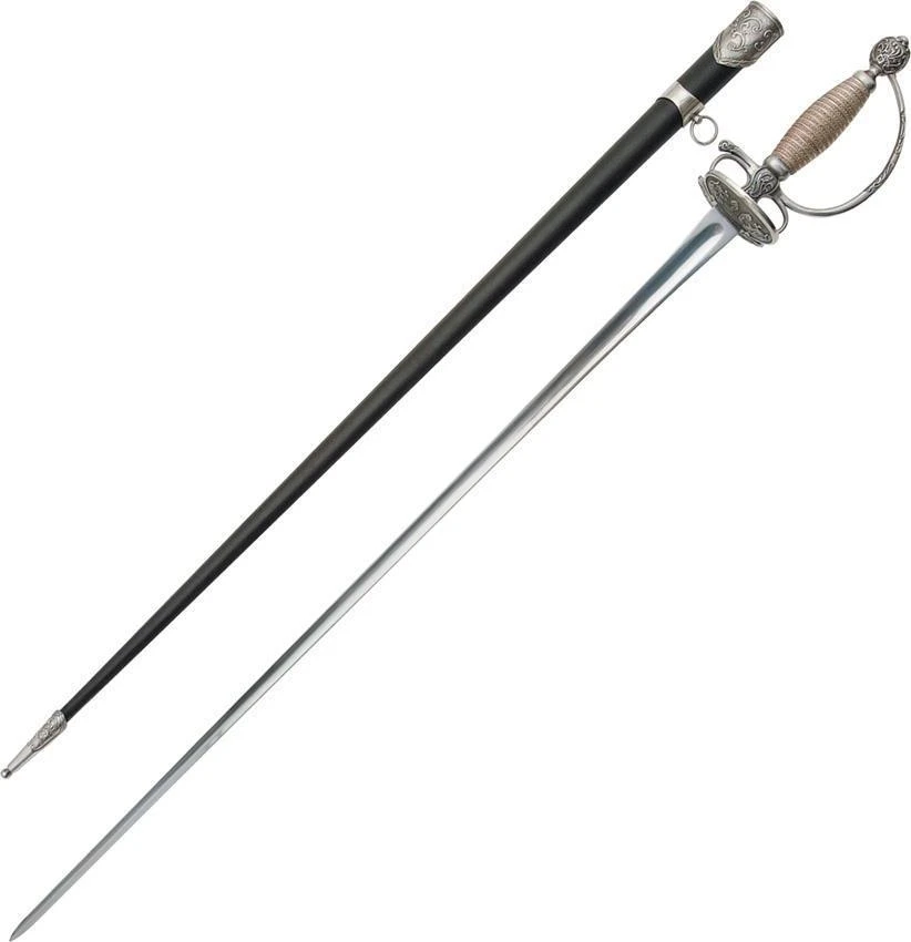 Construction: 1060 Carbon Steel; Overall: 37.875″; Blade: 30.75″ l Carbon Steel l Standard Edge; Other Info: Triangular shaped blade. Wire wrapped handle with a light, but strong knuckle guard. The hilt features two shells with functional finger loops. Leather scabbard with an intricately decorated throat and chape. Boxed.