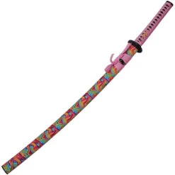 Construction: Damascus; Overall: 27.5″; Blade: 21″ l Damascus Steel l Standard Edge l High Polish Finish; Handle: Brown l Rayskin; Other Info: Hamaguri grind blade, peaked Iori Mune spine, and clay-tempered Hamon. Brown braid cord wrapped handle with brass Menuki featuring a crane motif. Black lacquered wood scabbard. Boxed.