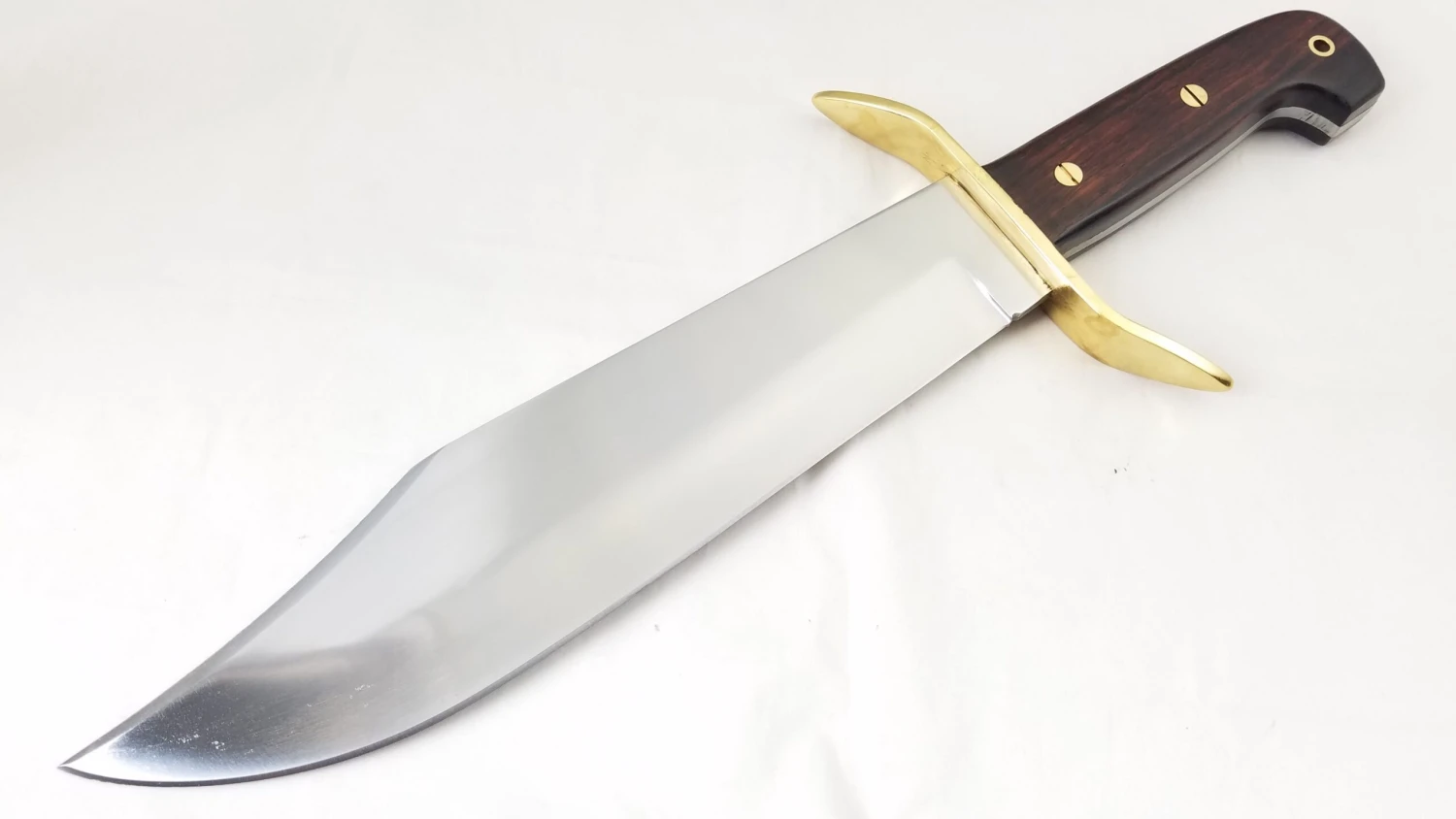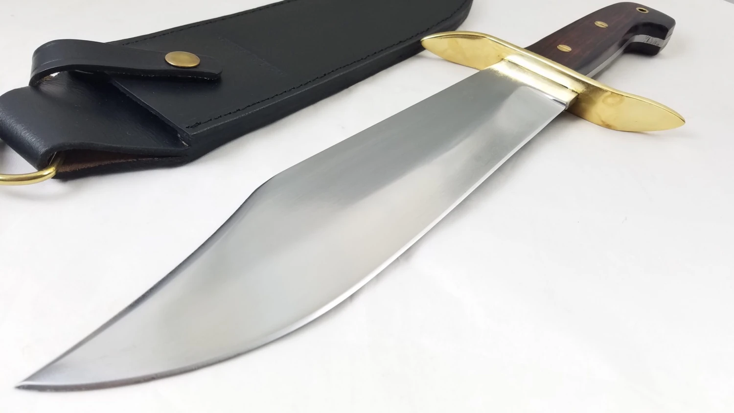 16″ overall. 10.75″ satin finish 1095HC steel blade. Rosewood handle. Brass guard. Full tang. Lanyard hole. Saber grind blade. False top edge. Black leather belt sheath. Boxed.