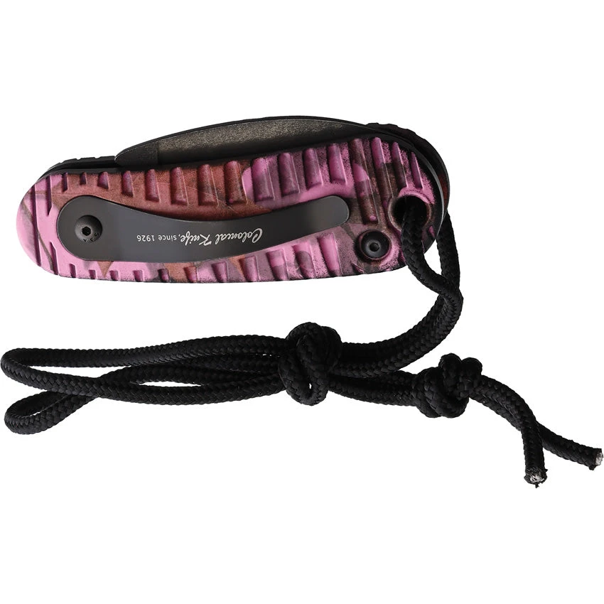 Automatic opening. 3.25″ (8.26cm) closed. 2″ (5.08cm) black oxide coated stainless blade. Pink camo ABS handle. Black cord lanyard. Safety mechanism. Oxygen tank key. Boxed.