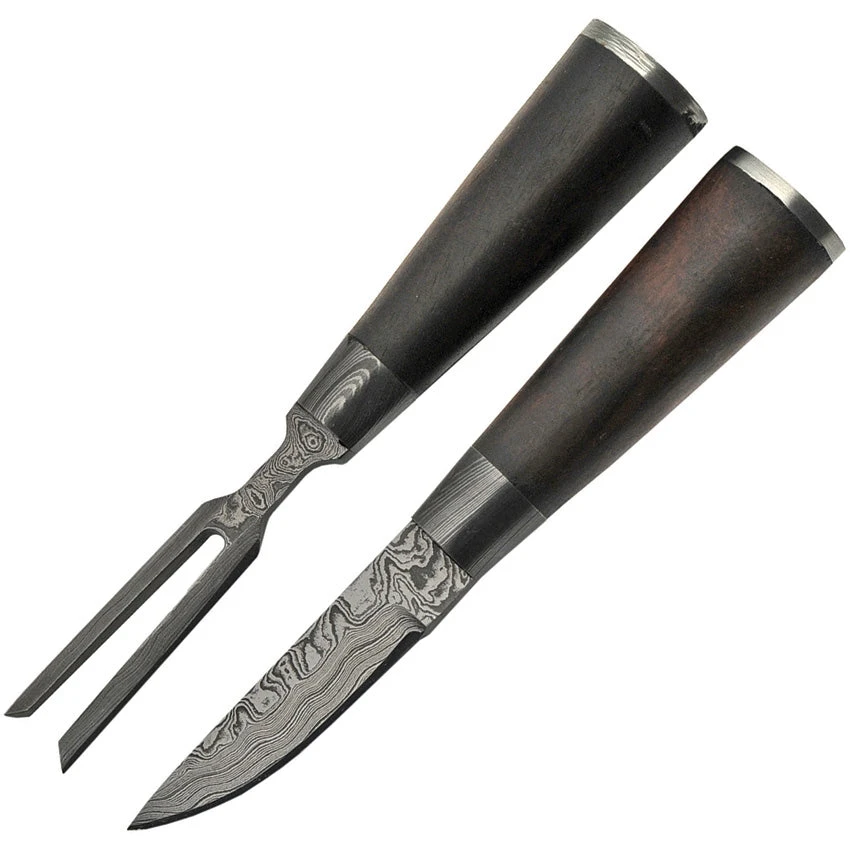 14.5″ (36.83cm) overall. 10.25″ (26.04cm) Damascus steel blade. Brown wood handle. Steel guard and pommel. Includes 6.5″ overall fixed blade with 3″ blade and 6.5″ overall fork with 2.75″ tines. Brown leather belt sheath. Boxed.