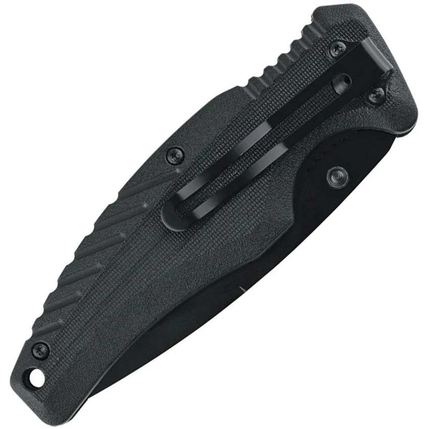 Assisted opening. 4.5″ closed. 3.13″ black finish 8Cr13MoV stainless blade. Black glass filled nylon handle. Thumb stud. Lanyard hole. Pocket clip. Clam packed.
