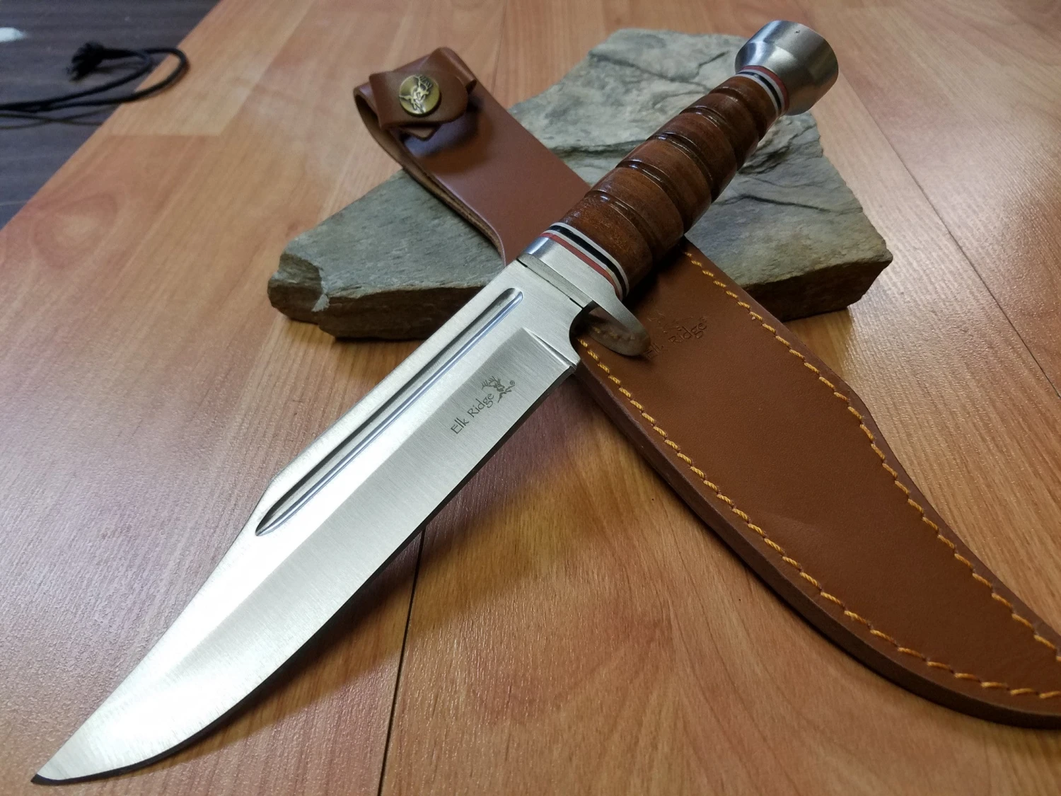 Elk Ridge Hunter. 11 3/4″ overall. 6 3/4″ 440 stainless blade with blood groove. Leather handle with brushed stainless finger guard and pommel. Leather belt sheath. Comes boxed.