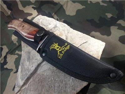 Elk Ridge Fixed Blade Knife – 9.5″ overall. 4.75″, 3.5MM mirror finish plain edge stainless steel blade. 4.75″ pakka and burl wood handle with brass pins. Full tang. Comes boxed w/ black nylon belt sheath.