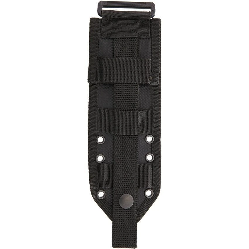 Fits Esee Models 3 and 4. Black nylon construction with lashing holes. The top of the MOLLE back has both an adjustable handle retention strap and a flap that can be slipped over the pommel of the knife and secured tight with the paracord and cord lock thus making the sheath jump safe. Both the top and lower portions of the MOLLE back have built-in belt loops and MOLLE straps. Color: Black. Bulk packed.