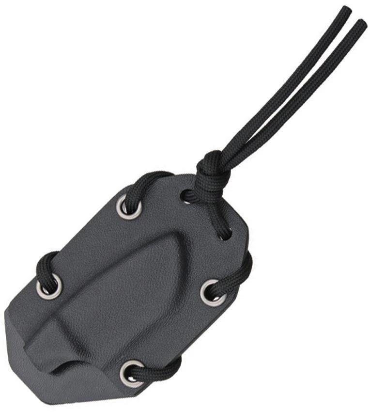 5″ overall. 1 3/4″ blade. One piece Bohler N690 stainless construction with stonewash finish. Molded black Kydex neck sheath with black cord lanyard.