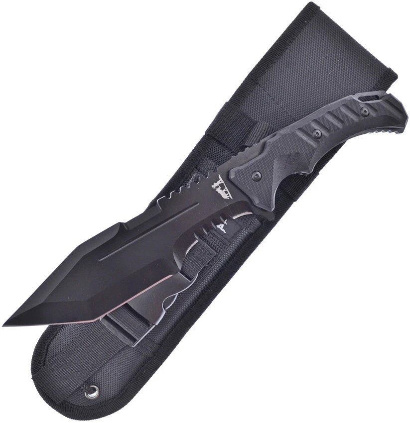 Blackhills Steel. 11.5″ (29.21cm) overall. 6.5″ (16.51cm) black finish partially serrated stainless blade. Black G10 handle. Full, extended tang. Lanyard hole. Black nylon belt sheath. Boxed.
