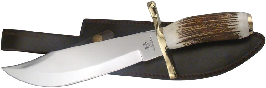 Whitetail Cutlery. 14″ overall. 9.5″ stainless clip point blade. Elk stag handle. Brass guard and pommel. Brown leather belt sheath. Boxed.