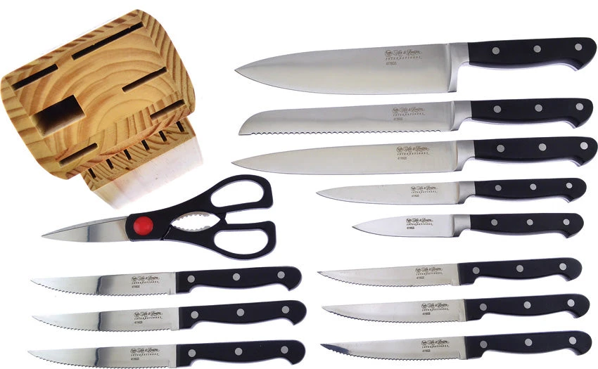 Satin finish 4116 stainless blade. Black ABS handle. Storage block. Full tang. Includes: 13″ overall Chef’s with 8″ blade; 12.5″ overall Slicing with 8″ blade; 12.5″ overall Bread with 8″ serrated blade; 8.5″ Utility with 5″ blade; 7.5″ overall Paring with 3.5″ blade; (6) 8″ overall Steak with 4″ serrated blade; scissors. Boxed.