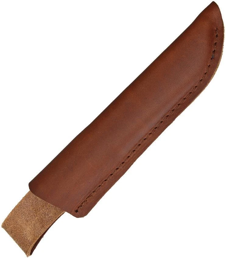 8 1/4″ overall. 3 3/4″ polished finish stainless Sandvik 12C27 steel blade. Black one-piece round design, rubberized handle with yellow trim. Deluxe brown leather belt sheath with protective insert. Boxed with hanging tab.