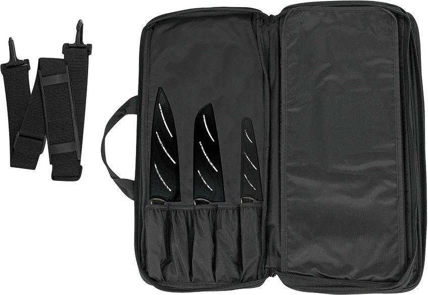 Space for up to 20 knives with secure elasticized pockets. PVC laminated 600D woven polyester with heavy duty nylon straps. Fully zippered with Velcro closures and padded reinforced handle. D-rings on each side for shoulder strap. Rigid supports inside the case resist crushing and ensure your knives are well protected. Bulk packed.