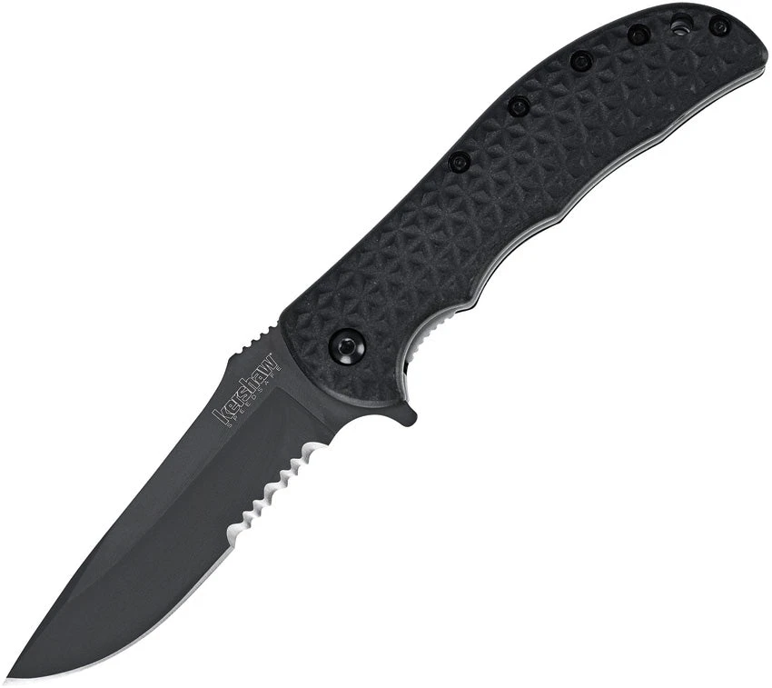 Assisted Opening. 3.875” closed. 3.125” Black oxide coated finish 8Cr13MoV partially serrated steel blade. Black glass-filled nylon handle. Linerlock. Lanyard Hole. Flipper Tab. Tip-Up and Tip-Down right carry pocket clip. Boxed.
