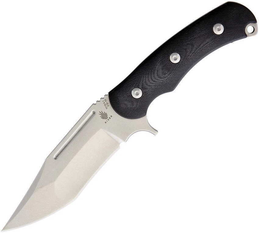 Kizer Super Bad Fixed Blade. 8.75″ overall. 4.72″ S35VN stainless steel blade. Full tang. Thumb rest. Black G10 handles. Lanyard Hole. Includes Kydex sheath. Designed by: Mikkel Willumsen.