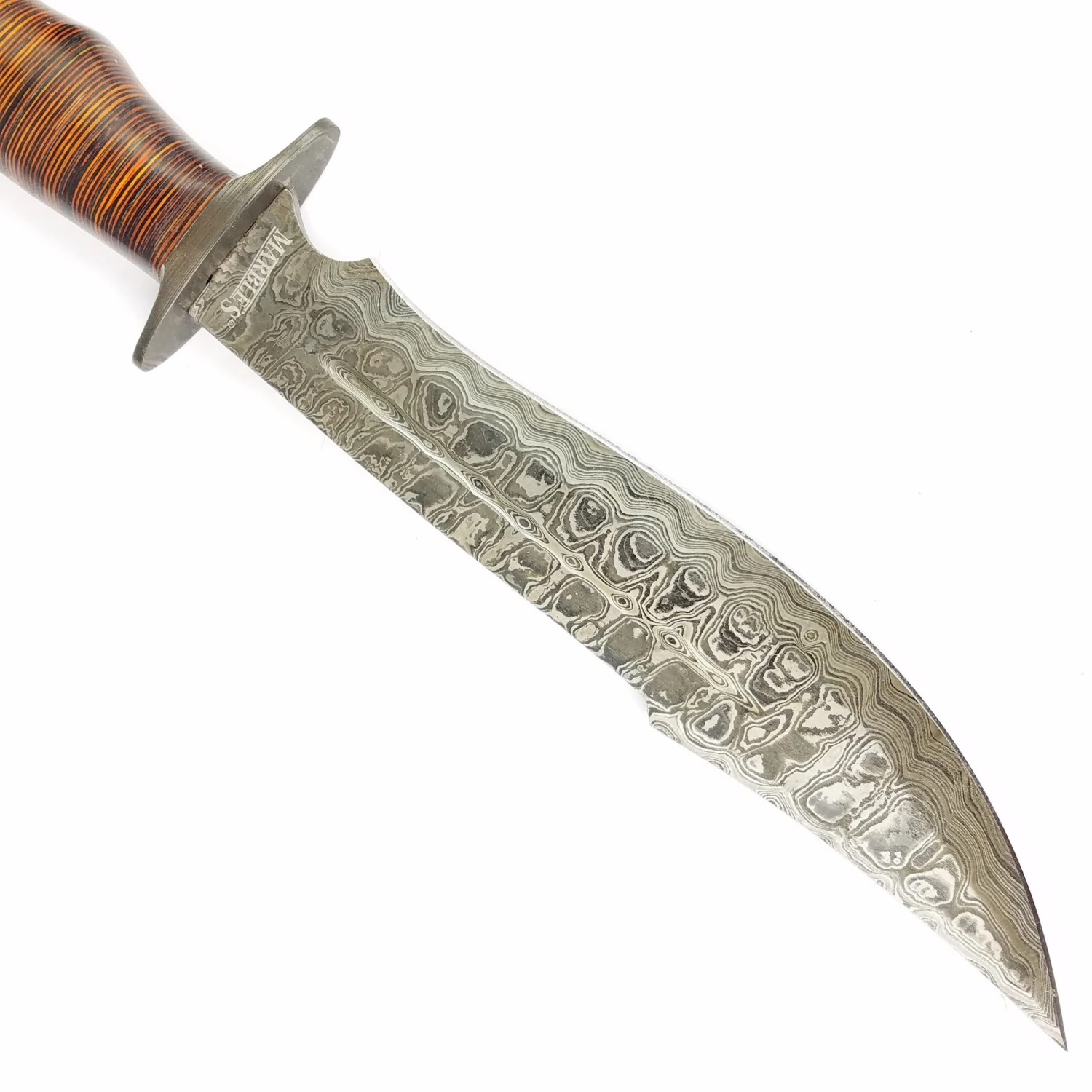 15″ (38.1cm) overall. 10″ (25.4cm) Damascus steel bowie blade. Stacked leather handle. Damascus guard. Brown leather belt sheath. Boxed.