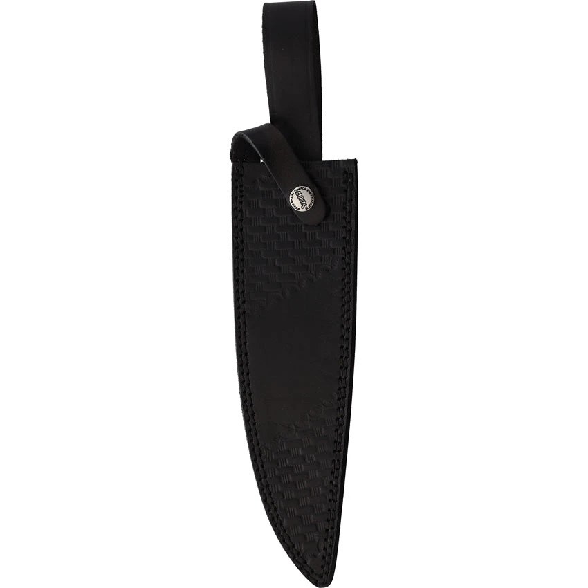 15.25″ (38.74cm) overall. 10″ (25.4cm) satin finish stainless bowie blade. Stainless bolster(s). Full tang. Horn and turquoise handle. Black leather belt sheath. Boxed.