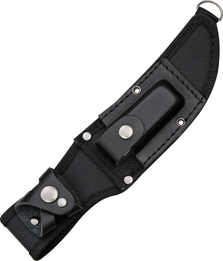 10″ overall. 5 1/2″ stainless bowie blade with Bear Creek Hunter etching. Sculpted hollow aluminum handle with integrated finger guard and etched black bear artwork. Stored inside handle is survival kit and compass. Black nylon belt sheath with black leather stone pouch and included 2 1/4″ x 3/4″ Arkansas sharpening stone. Comes boxed.