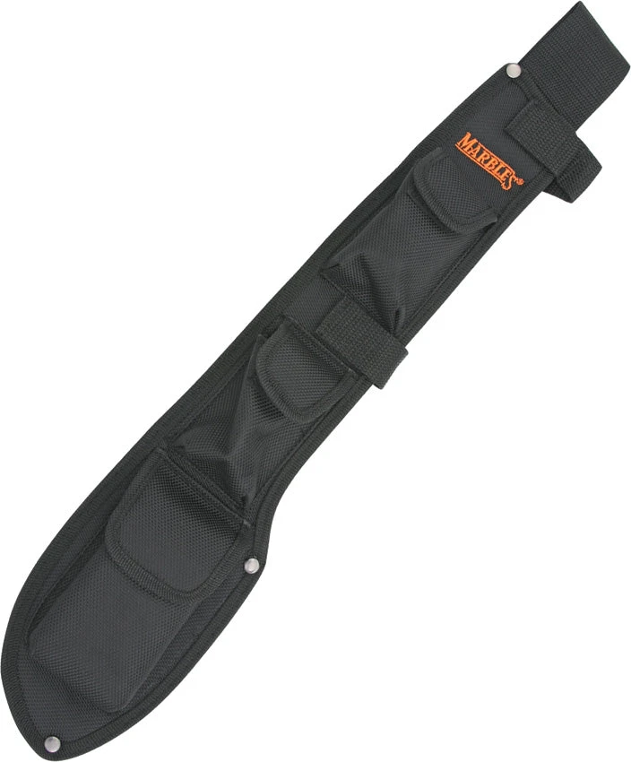 Heavy black nylon construction with orange embroidered Marbles logo. Features two cargo pouches plus a pouch with sharpening stone. Made to fit MR33514 Bolo Camp Knife. Bulk packed.