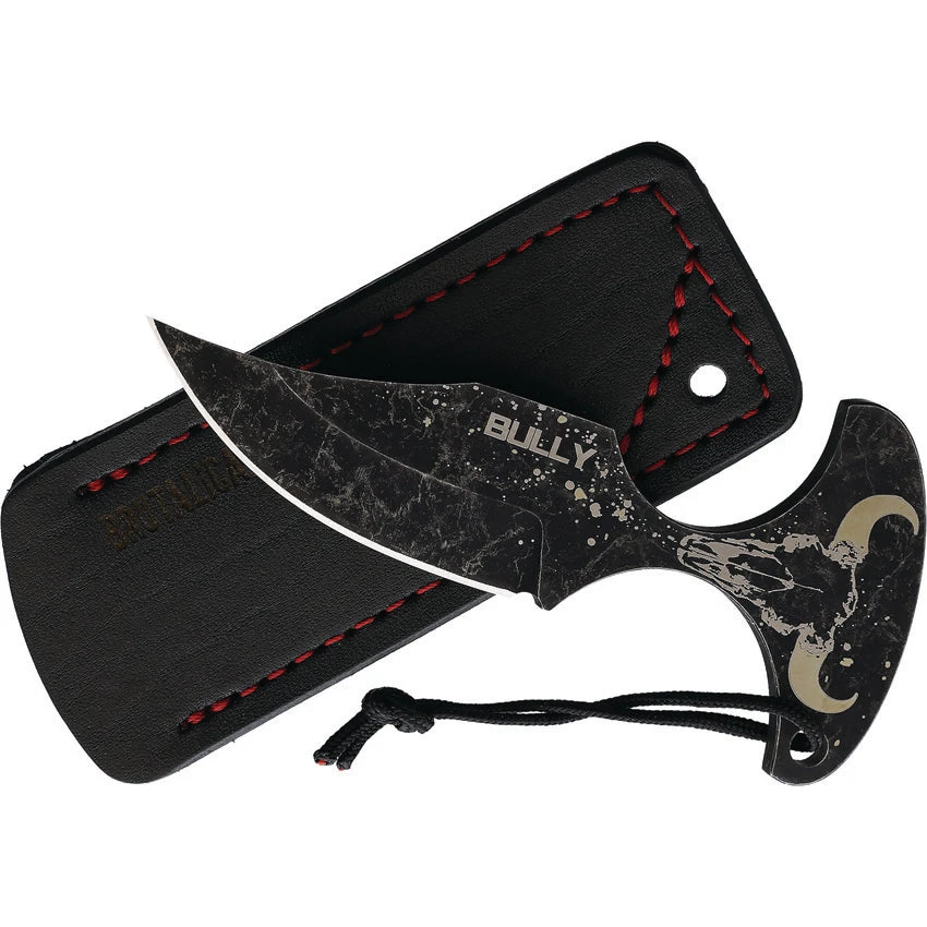 4.25″ (10.8cm) overall. 2.5″ (6.35cm) black stonewash finish AUS-8 stainless clip point blade. Lanyard hole. One-piece construction. Black leather sheath. Boxed.