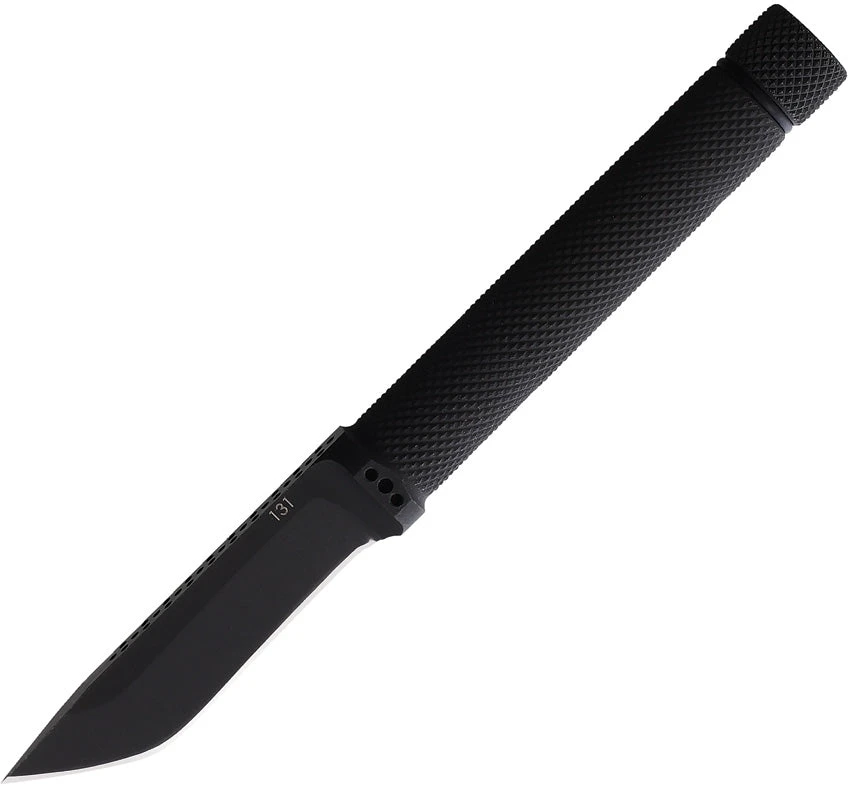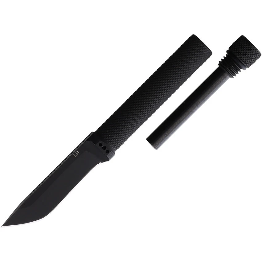 4.5″ (11.43cm) overall. 1.75″ (4.45cm) black finish D2 tool steel blade. Tanto grind blade. Machined from 0.5″ diameter bar-stock. Spine can be used as a ferro rod striker. Ferro rod screws into handle. Kydex neck sheath. Bulk packed.