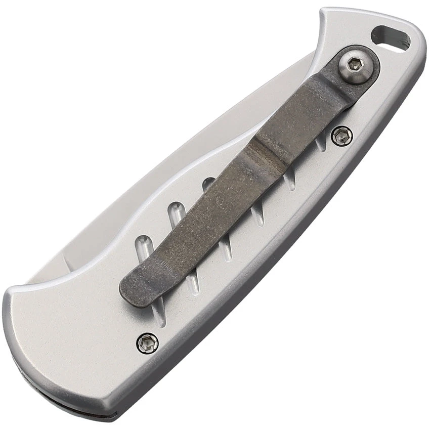 Automatic opening. 3.38″ (8.59cm) closed. 2.5″ (6.35cm) mirror finish 154CM stainless blade. Silver anodized aluminum handle. Lanyard hole. Pocket clip. Boxed.