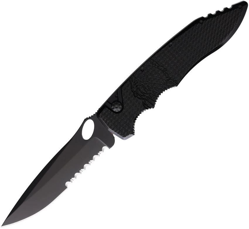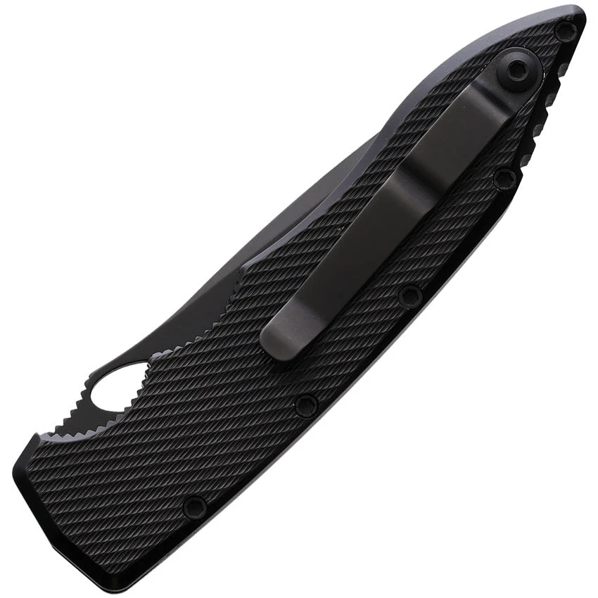 Automatic opening. 4.25″ (10.8cm) closed. 3.5″ (8.89cm) black DLC coated partially serrated CPM S30V stainless spear point blade. Black aluminum handle. Pocket clip. Thumb pull. Boxed.