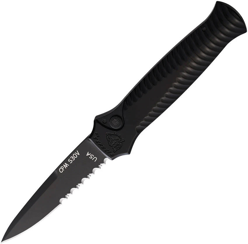 Automatic opening. 3.63″ (9.22cm) closed. 2.75″ (6.99cm) black DLC coated partially serrated CPM S30V stainless spear point blade. Black aluminum handle. Pocket clip. Boxed.