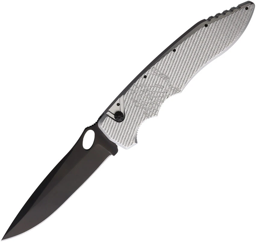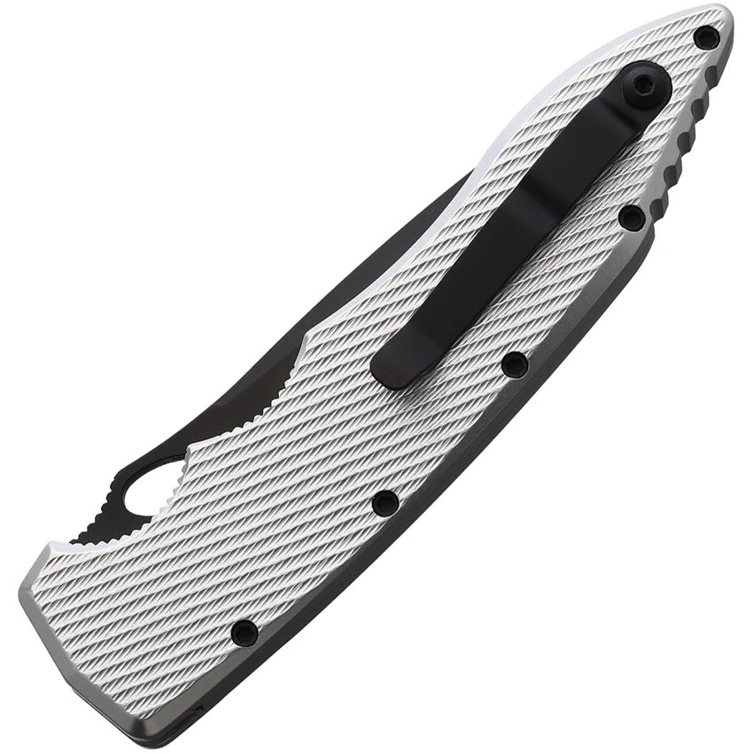Automatic opening. 5″ (12.7cm) closed. 4″ (10.16cm) black finish CPM S30V stainless blade. Silver textured aluminum handle. Thumb pull. Pocket clip. Boxed.