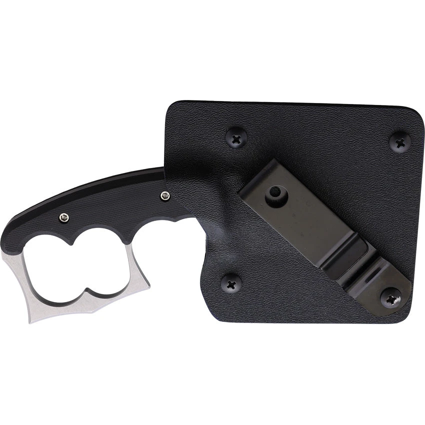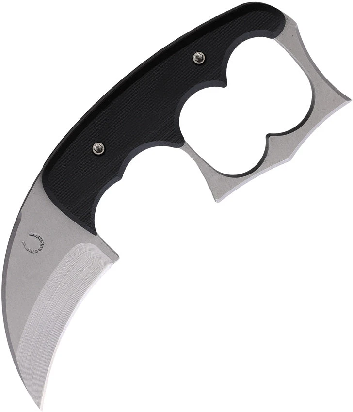 6” overall. 2.25” Stonewashed finish heat treated D2 Steel karambit blade. Black G10 handle. Full Tang. Black kydex sheath with belt clip. Boxed.