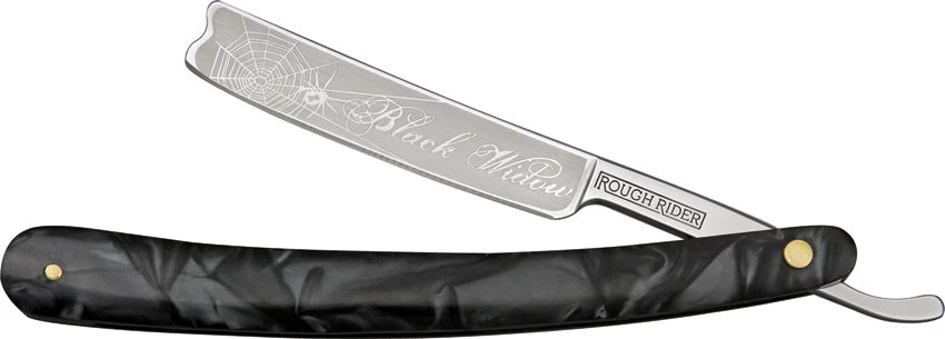 Collector’s Edition Straight Razor Series. 6 1/2″ closed. 440 stainless razor blade with “Black Widow” frosted blade etch. Midnight swirl celluloid handles.