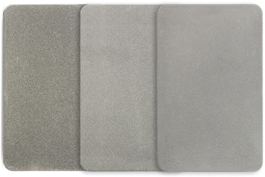 Grit: Extra fine l Fine l Coarse. Credit card size. Ring grip holding. Mirror polished finish on rear side for emergency signaling. Leather slip pouch for each. Clam packed.