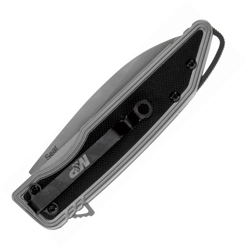 Assisted opening. 4″ (10.16cm) closed. 3″ (7.62cm) satin finish 8Cr13MoV stainless Wharncliffe blade. Stainless handle with black G10 inlay. Extended tang. Lanyard hole. Pocket clip. Boxed.