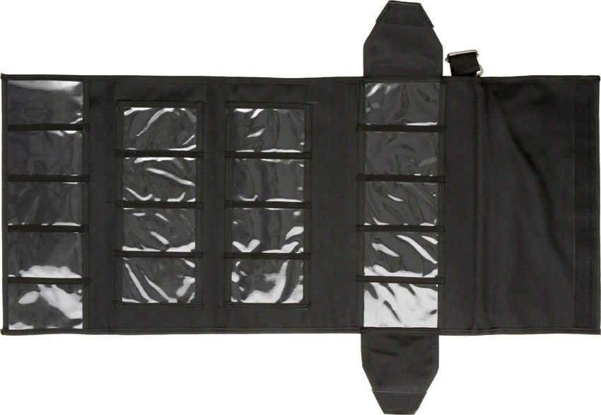 16″ x 8″ closed. 18 interior pockets measure 4 1/2″ x 2 1/2″. Black polyester denier construction with oversized clear viewing pockets. Velcro top and side closures. Adjustable shoulder strap. Gold embroidered Spyderco bug logo. A secure way to transport, store and display knives.