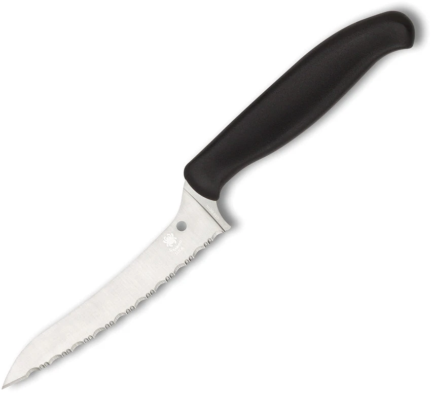 8.75″ (22.23cm) overall. 4.5″ (11.43cm) satin finish serrated CTS-BD1 stainless blade. Black polypropylene handle. Dishwasher safe. Round hole. Clam packed.