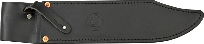 Replica is 15 3/4″ overall. 11″ high carbon tool steel blade. Full tang. Brown wood handle. Black leather belt sheath. Made in New Zealand.