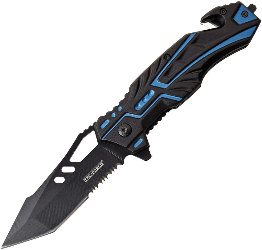 Linerlock. Assisted opening. 4.75″ closed. 3.5″ black finish partially serrated 3Cr13 stainless tanto blade. Black and blue anodized aluminum handle. Extended tang. Thumb pull. Glass breaker. Belt/cord cutter. Pocket clip. Boxed.