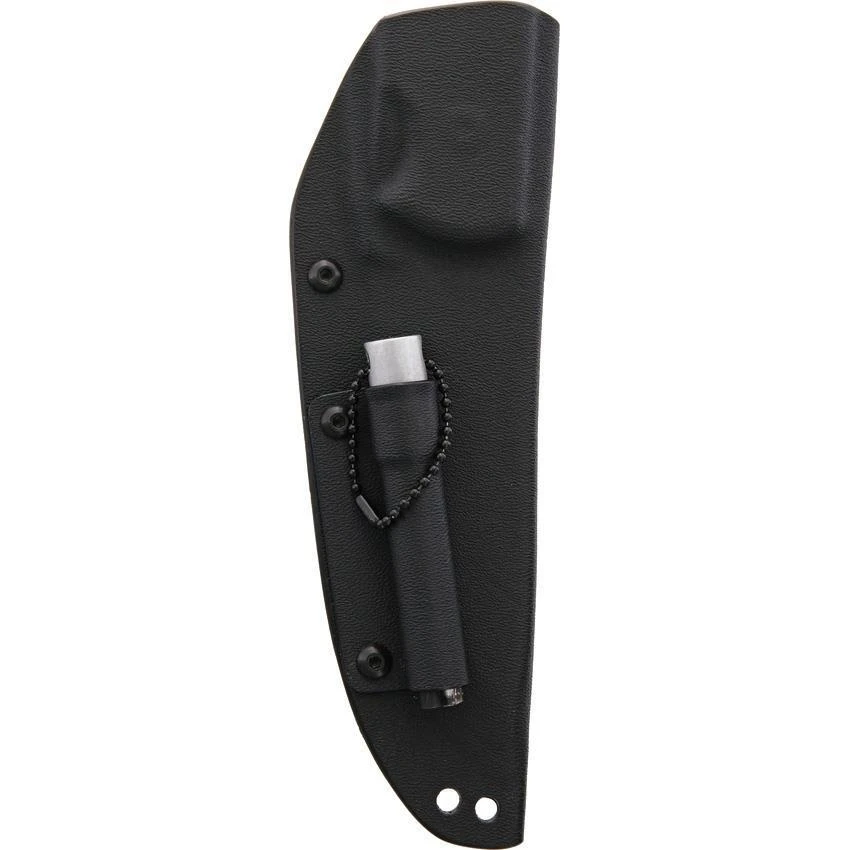 9 3/4″ overall. 4 1/2″ 1095 high carbon steel drop point blade with partial tumble finish, modified Scandinavian grind, and thumb ridge. Full tang. Gray canvas micarta handles with lanyard hole. Handle features a divot that can be used as a socket for the fire bow drill method. Pommel features a scraper specially designed for striking Ferro rods in a safe and efficient manner. Black molded Kydex belt sheath with built-in ferro rod attachment point. Comes with fire starter and survival whistle. Bulk packed.