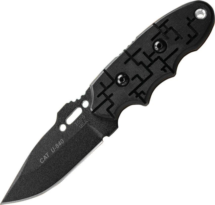 7 1/4″ overall. 3 1/4″ black traction coated 1095 high carbon steel hunter’s point blade with lashing holes/slot and thumb ridge. Full tang. Cryptic Cyber handle scales (Black G-10). Lanyard hole. Black molded Kydex belt sheath with rotating clip. Comes with black TOPS survival whistle. Bulk packed.