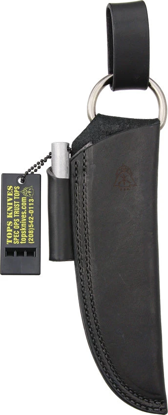 Embossed black leather American Steerhide belt sheath with stainless D-ring, snap over strap and side slip pouch for storing your fire starter. Vegetable tanned. Fits Brother’s of Bushcraft (BROS-01), Dragonfly 4.5 (DFLY-4.5), Hunter of Gunmen 4.5 (HOG-4.5), Mohawk Hunter (MKH01), Shango-XL (SHGO-XL) and Spirit Hunter (SHR-01). Includes 2 3/4″ overall black TOPS survival whistle and 3 1/8″ overall fire starter with 2″ rods. Bulk packed.