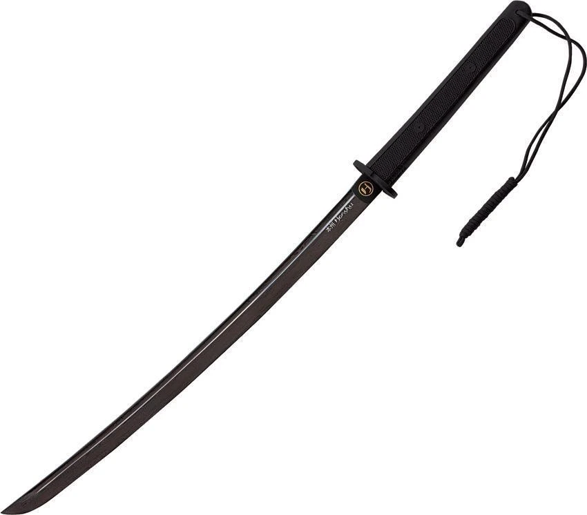 30 1/2″ overall. 20 5/8″ black Damascus steel blade with heavy fuller groove that extends the entire length of the blade. Full tang. Black textured rubberized handle. Black finish stainless guard with dual lashing holes. Black nylon cord lanyard. Black wooden scabbard with black splatter accents, black nylon cord wrapping and black composition accents at throat. Black cotton storage bag.