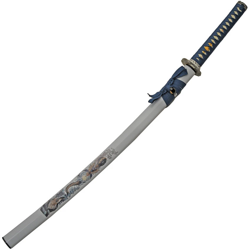 41″ (104.14cm) overall. 30″ (76.2cm) 1045 carbon steel blade. Blue cord wrapped handle. Water dragon print PVC scabbard. Boxed.