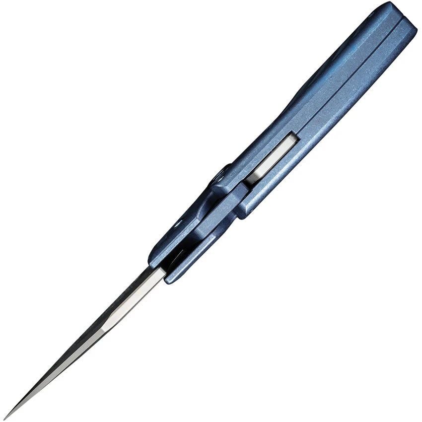 6.25” overall. 2.27” Silver bead blasted finish CPM-20CV steel blade. Flat Grind. Blue 6AL4V titanium handle. Black leather sheath. Boxed.