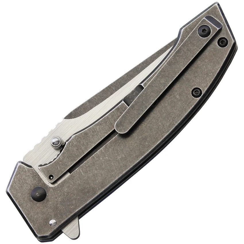 Assisted opening. 4.5″ closed. 3.5″ two-tone finish stainless blade. Carbon fiber over G10 handle with black stonewash finish stainless back handle. Extended tang. Thumb stud. Pocket clip. Boxed.